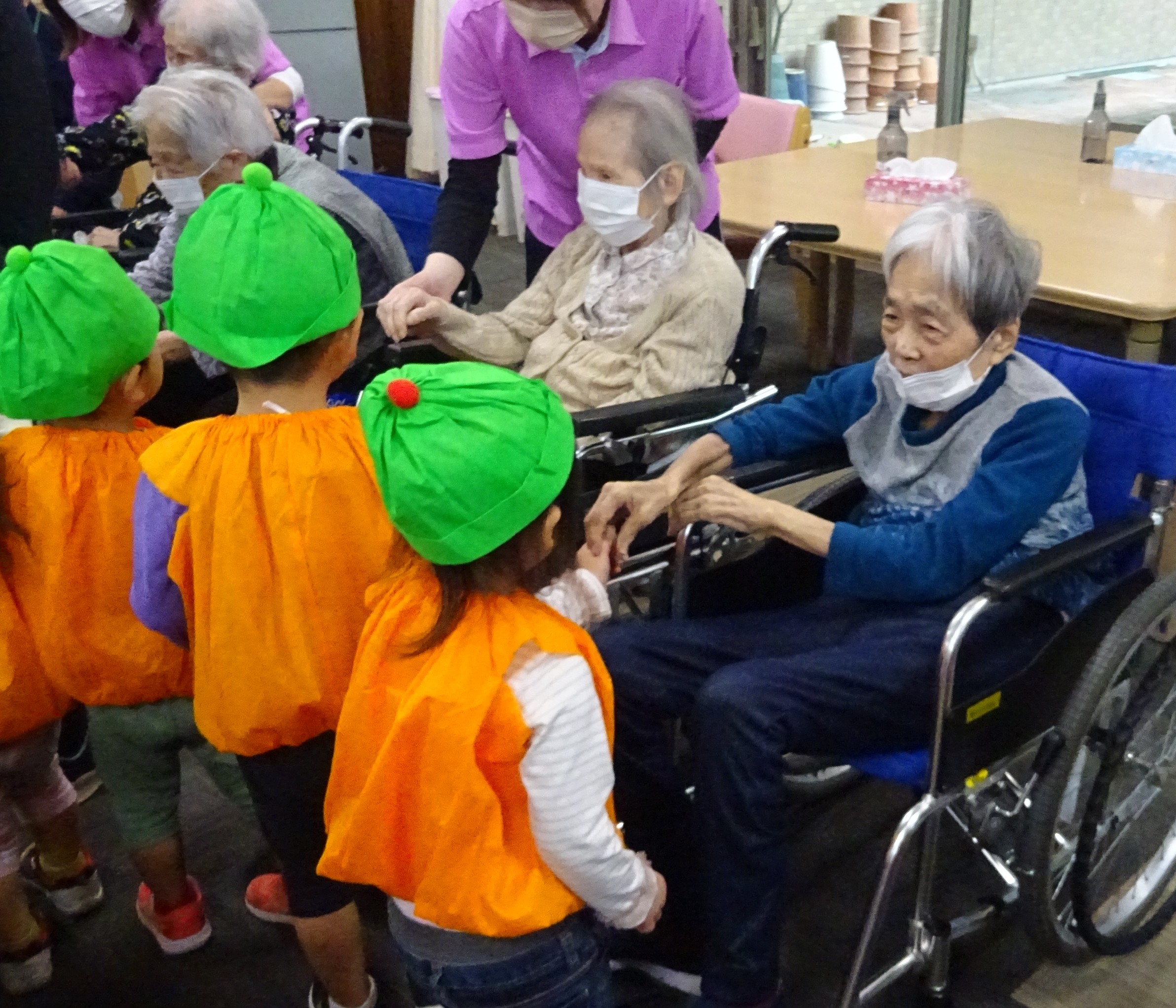 仮装をした子どもたちが遊びに来てくれました♪歌や踊りも披露してくださりとても可愛くにぎやかな時間でした。 イタズラされないように?!利用者様から子どもたちへお菓子のプレゼントをしました(^^)