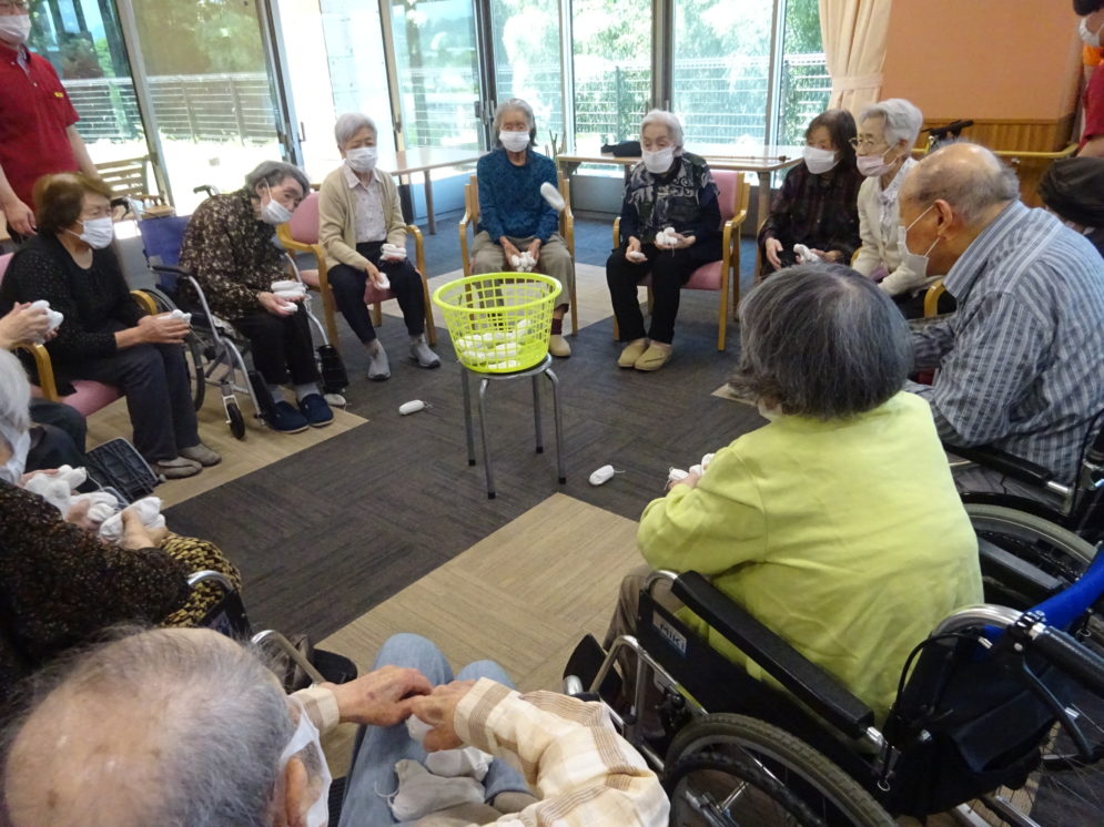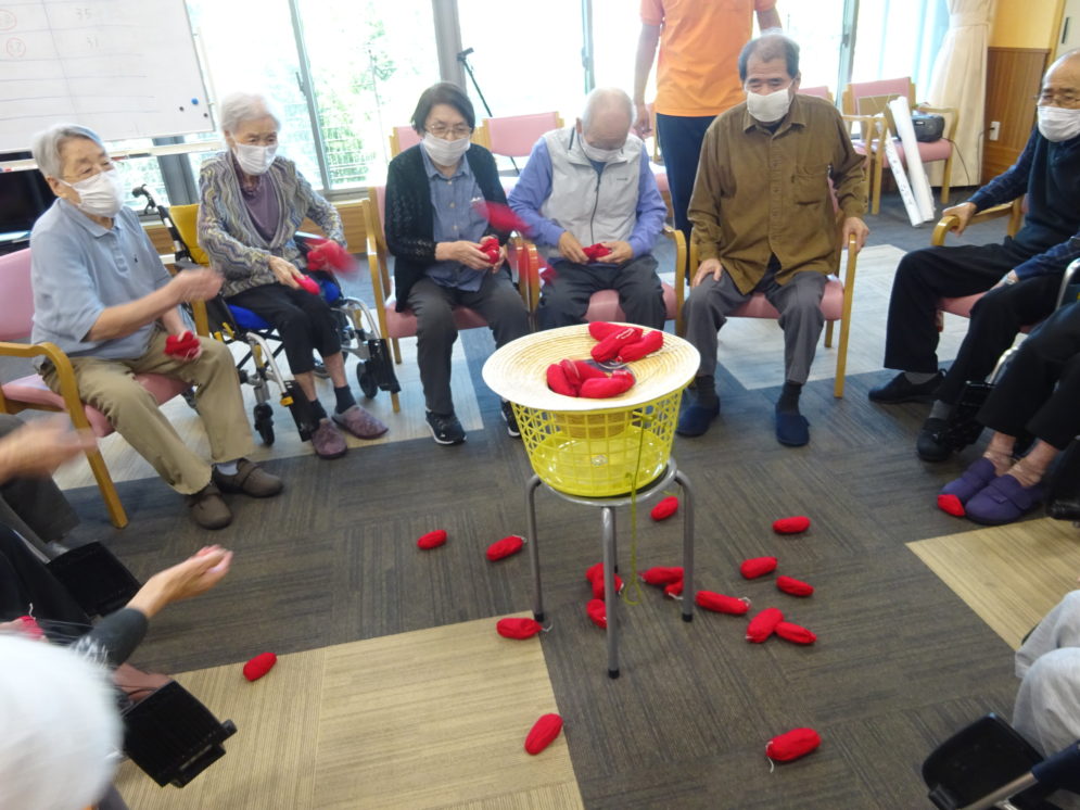 玉入れをしました!入ったり入らなかったりですが皆さん真剣な眼差しで、カゴをめがけて投げてます!